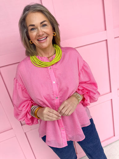 Meet your new statement staple—the Stripe Expectations Top in Pink! This Stripe Expectations Top is a beauty that features playful balloon sleeves...