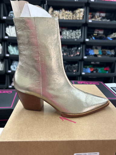 Elevate your style with Matisse Caty Gold Crinkle booties. This chic leather ankle boot features a pointed toe and block heel, perfect for your fal...