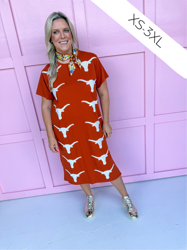 Show your team spirit in style with the Texas® Mascot Midi Tee Dress by Queen of Sparkles! 🧡🏈 Our Queen of Sparkles Texas® Mascot Midi Tee Dress...