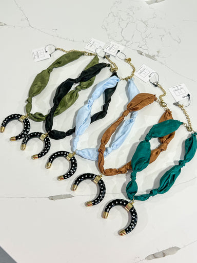 Up your accessory game and top off your outfit with these new solid silk scarf necklaces by Hart Designs with marble clover pendants! This bold col...