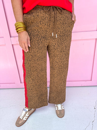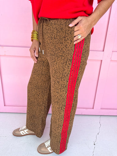 Embrace your wild side with the Wild Streak Pants! Our Spotted Leopard Pants features a playful brown leopard print and bold red side piping. The w...