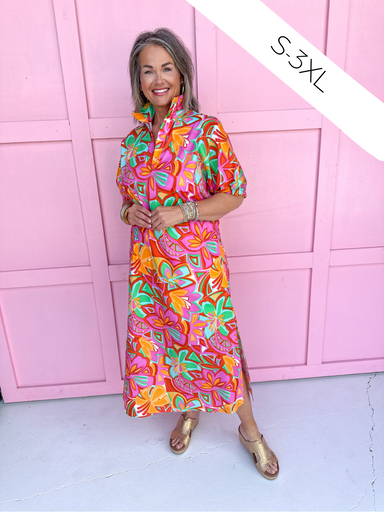Twirl into spring with the Briarose Winslow Mini Dress! Our Winslow Mini Dress is a vibrant fuchsia stunner adorned with warm gold and orange flora...