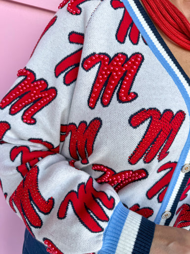 Turn heads from tailgate to touchdown in the Queen of Sparkles Ole Miss® Knit Mascot Cardigan! ❤️💙🏈 This Queen of Sparkles Ole Miss® Knit Mascot Ca...