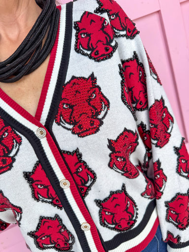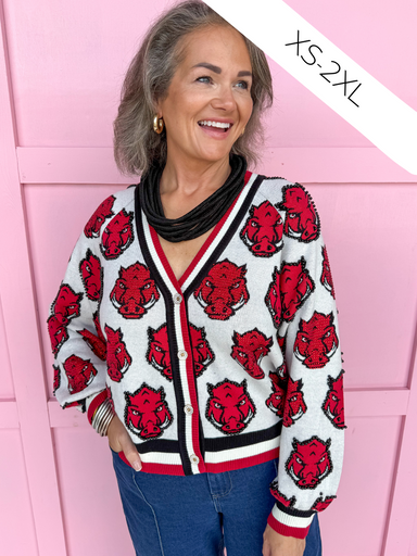 Turn heads from tailgate to touchdown in the Queen of Sparkles Arkansas® Mascot Knit Cardigan! ❤️🐗🏈 This Queen of Sparkles Arkansas® Mascot Knit Ca...