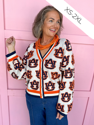 Turn heads from tailgate to touchdown in the Queen of Sparkles Auburn® Knit Mascot Cardigan! 🧡💙🏈 This Queen of Sparkles Auburn® Knit Mascot Cardi...