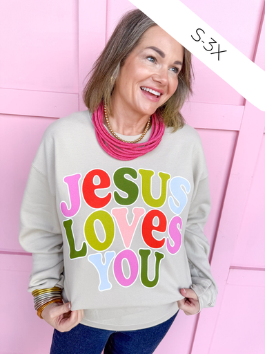 This khaki cutie features “Jesus Loves You” spelled out in bright, playful letters—each one a different mix of pinks, reds, greens, and blues, all ...