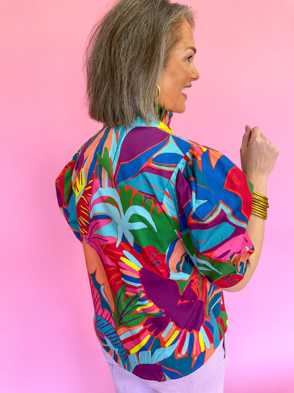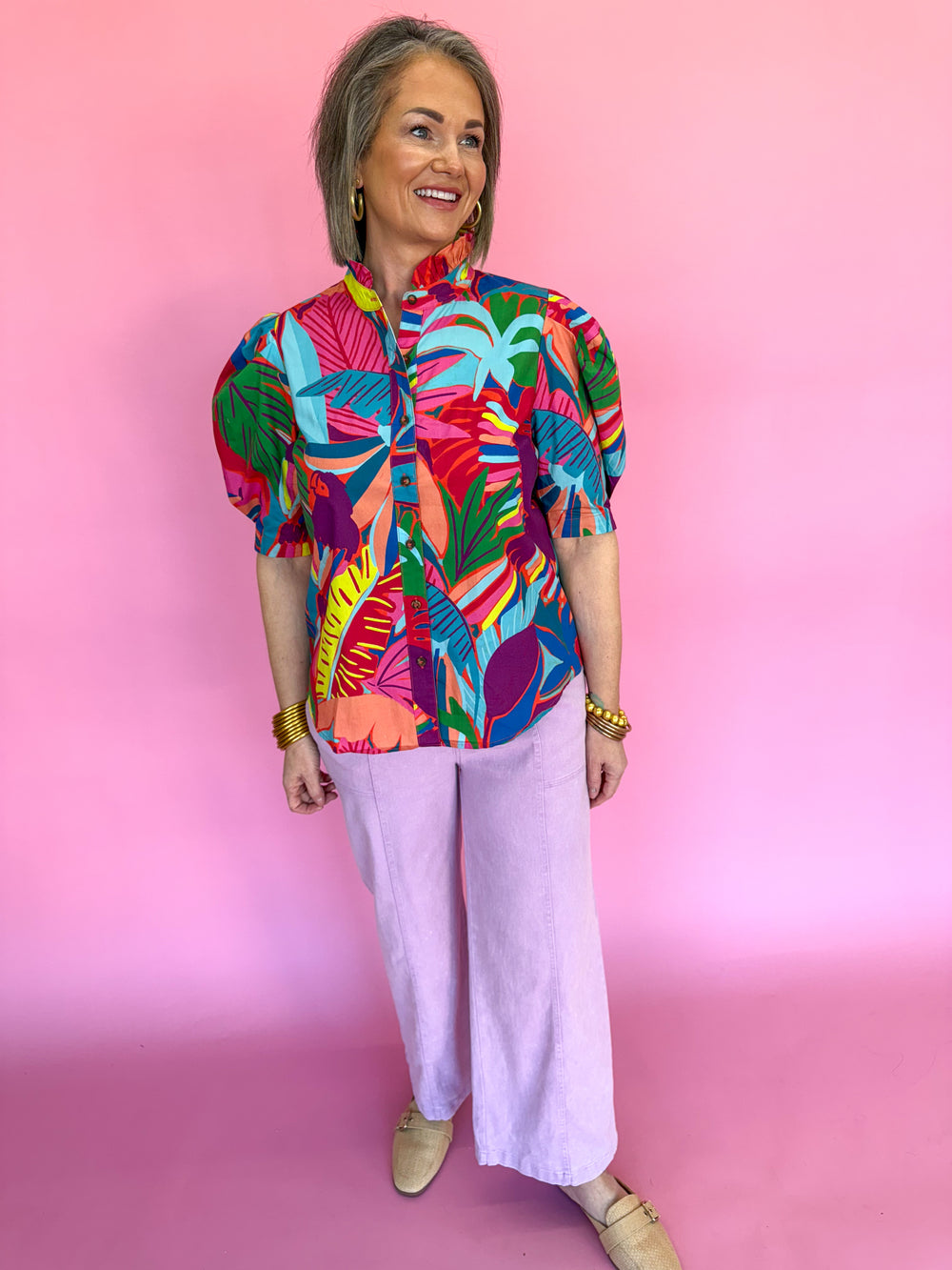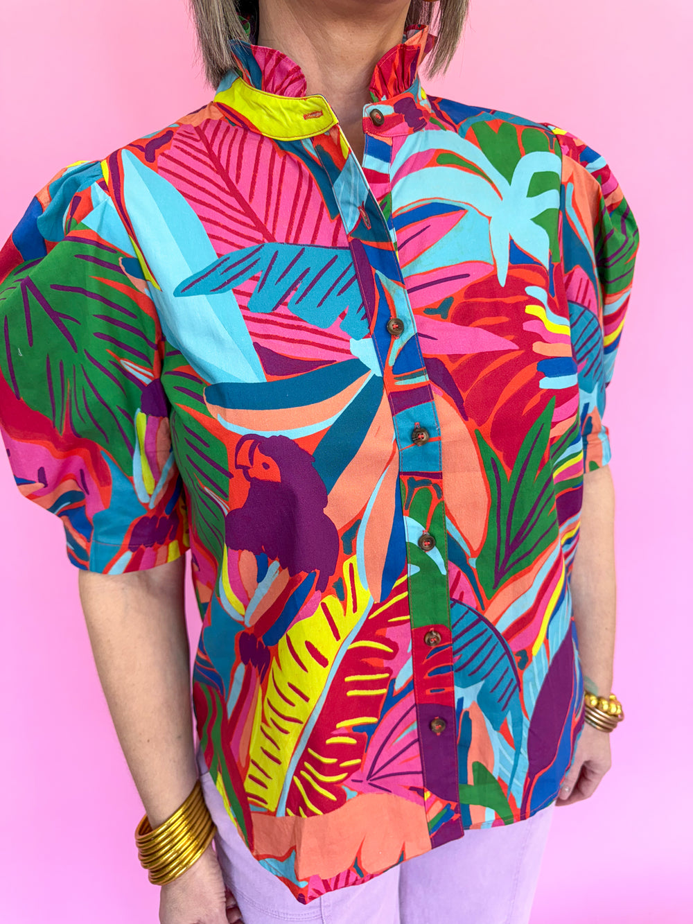 KARLIE | Birds of Paradise Button Puff Sleeve Top | Jincy's Southern Exchange